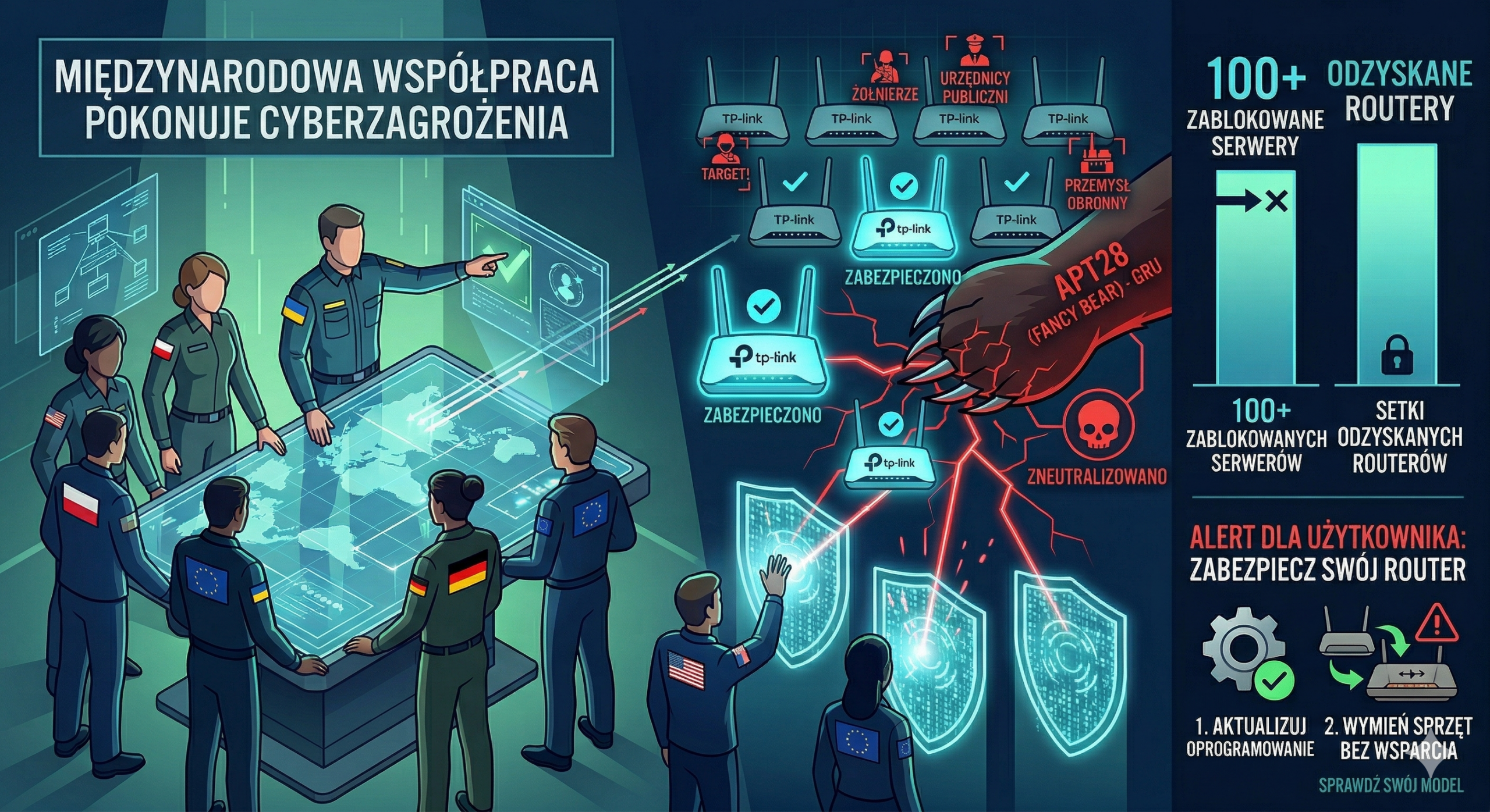 Efekty operacji W wyniku skoordynowanych działań zablokowano ponad 100 serwerów i odzyskano kontrolę nad setkami urządzeń. Eksperci przypominają: kluczowym elementem ochrony przed takimi atakami są regularne aktualizacje oprogramowania lub wymiana sprzętu, który nie posiada już wsparcia producenta.